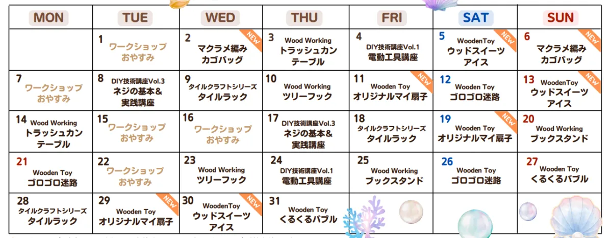 毎年恒例、DCM DIY placeがこの夏も充実したワークショップをお届けします。7月は、新作のワークショップが続々登場。大人から子どもまで楽しめるプログラムが日替わりで用意されており、DIYを楽しむ絶好の機会です。会場は、涼しく快適な室内なので、暑さを気にせずに思う存分クリエイティブな時間を楽しめます。
