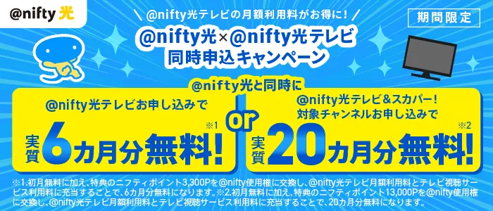 - 「@nifty光」と同時に「@nifty光テレビ」および「スカパー!」対象チャンネルに申し込みした方に13,000ポイント