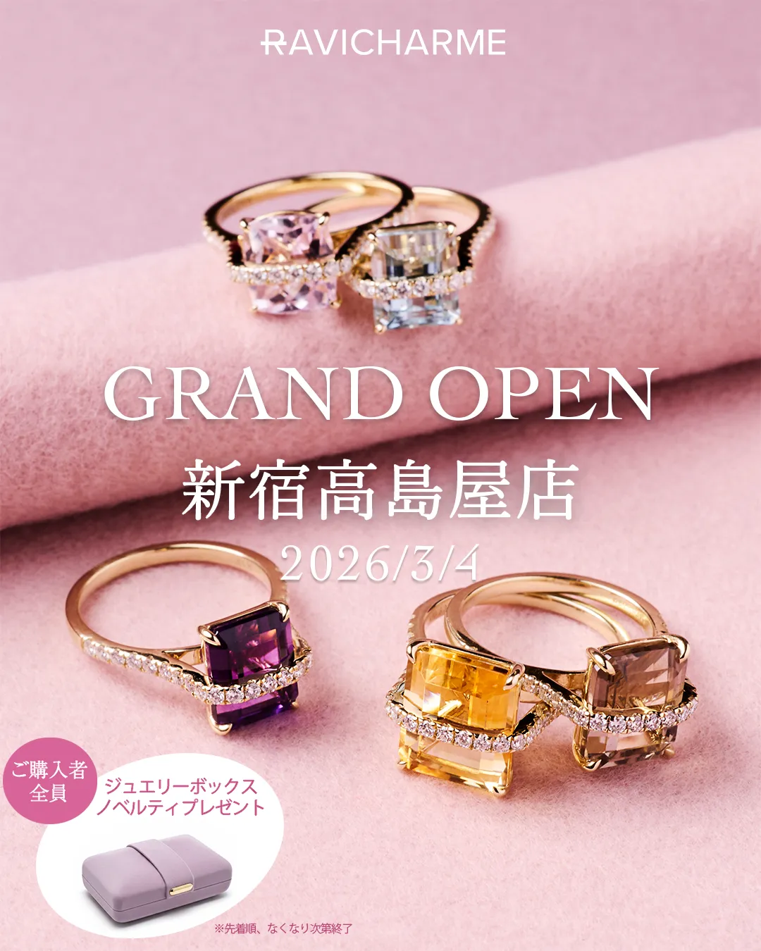 また、オープンを記念して、新宿高島屋店での購入者には特別な特典を二つ用意しています。第一に、購入した全員に「オリジナル ジュエリーボックス」をプレゼント。このボックスにはRAVICHARMEのロゴがあしらわれ、エレガントなデザインでありながら機能性も兼ね備えています。第二に、30万円以上の購入者には「ジュエリーガチャ」のプレゼントがあります。これはポップアップイベントで人気のアイテムで、何が出るかはお楽しみとなっており、登録された色やデザインのストーンから選べる楽しさが詰まっています。