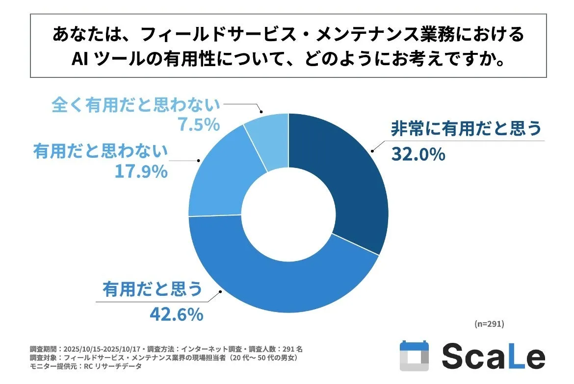 株式会社オプティマインドが実施した「フィールドサービス・メンテナンス業界におけるAIツール活用実態に関する調査」の結果、フィールドサービスやメンテナンスの現場で働く担当者の約75%が、業務でのAIツール活用を「有用」と感じていることが分かりました。この結果は、AI技術の進化が業務の効率化に対する期待を反映しています。