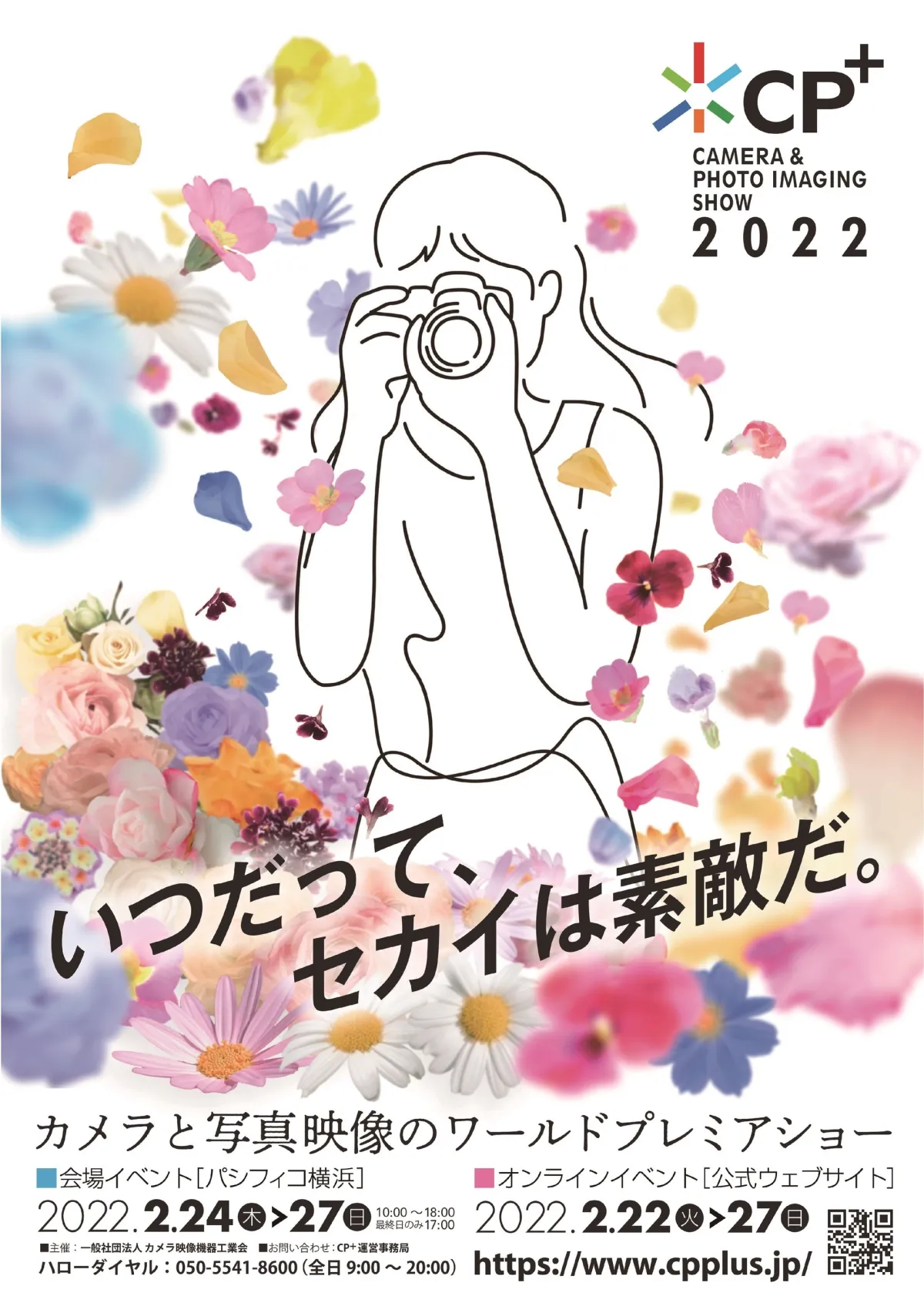 CP+2022では、カメラや写真、映像についてのトピックを幅広くカバーします。主催者によるキーなコンテンツとして、キーノートスピーチやデジタルカメラマーケットに関するセミナーが予定されています。この年の開催テーマは「いつだって、セカイは素敵だ。」です。