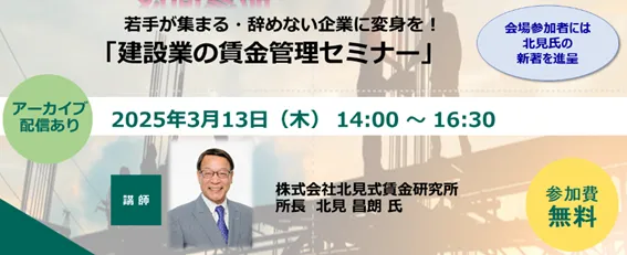 2025年3月13日、建設業界の企業向けに特別なセミナーが開催されます。このセミナーのテーマは「若手が集まる・辞めない企業に変身を!」であり、具体的には建設業の賃金管理について深く掘り下げます。