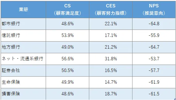 今回の調査結果では、業態別にCS、CES、NPSの平均スコアを算出しました。比較結果において、CSは都市銀行と損害保険会社が最も低い点数を記録しました。一方、ネットバンクや流通系銀行は依然としてすべての指標において高評価を得ている傾向が見られました。これは利用者が便利さや時間の効率性を重視していることを反映しているのかもしれません。