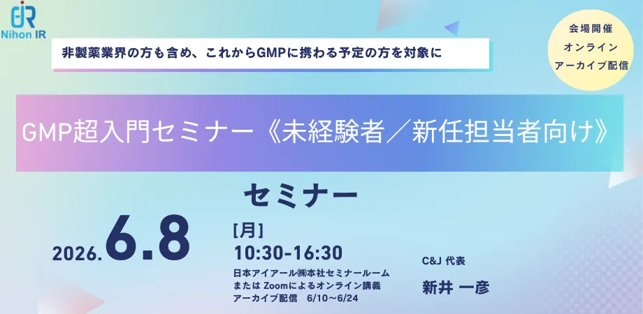医薬品業界における法令遵守、特にGMP(Good Manufacturing Practice)の理解は、品質と安全性を確保するために重要です。しかし、未経験者や新任担当者にとって、GMPについて学ぶことは容易ではありません。そんな方々に最適なプログラムである「GMP超入門セミナー」が、2026年6月8日に開催されます。