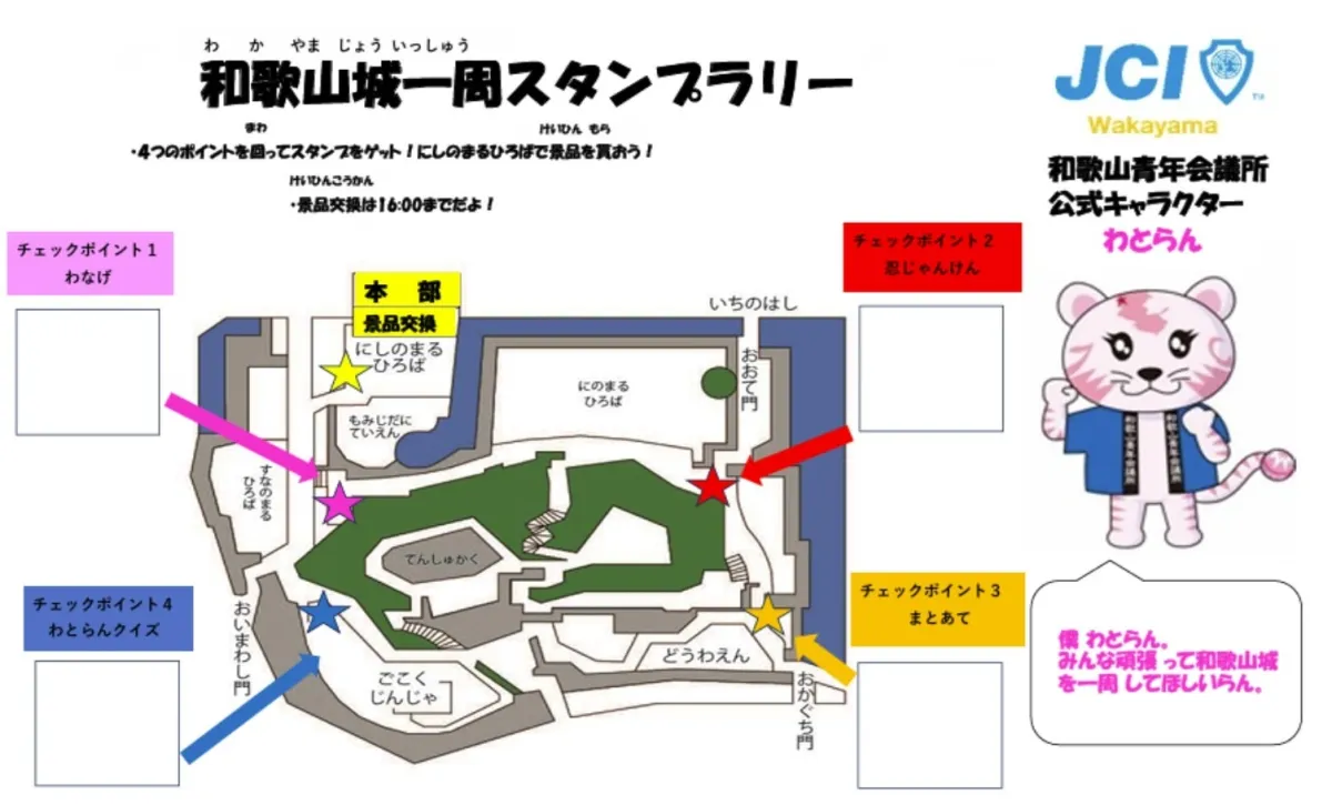 この祭りでは、一般社団法人和歌山青年会議所が主催する和歌山城一周スタンプラリーが実施されます。参加者は和歌山城の周囲を巡りながら、各チェックポイントでスタンプを集めることができます。スタンプラリーでは、和歌山青年会議所の公式キャラクター「わとらん」にちなんだクイズや、楽しさ満点の輪投げゲームなどが用意されており、子どもたちにとっては飽きることのない体験となるでしょう。