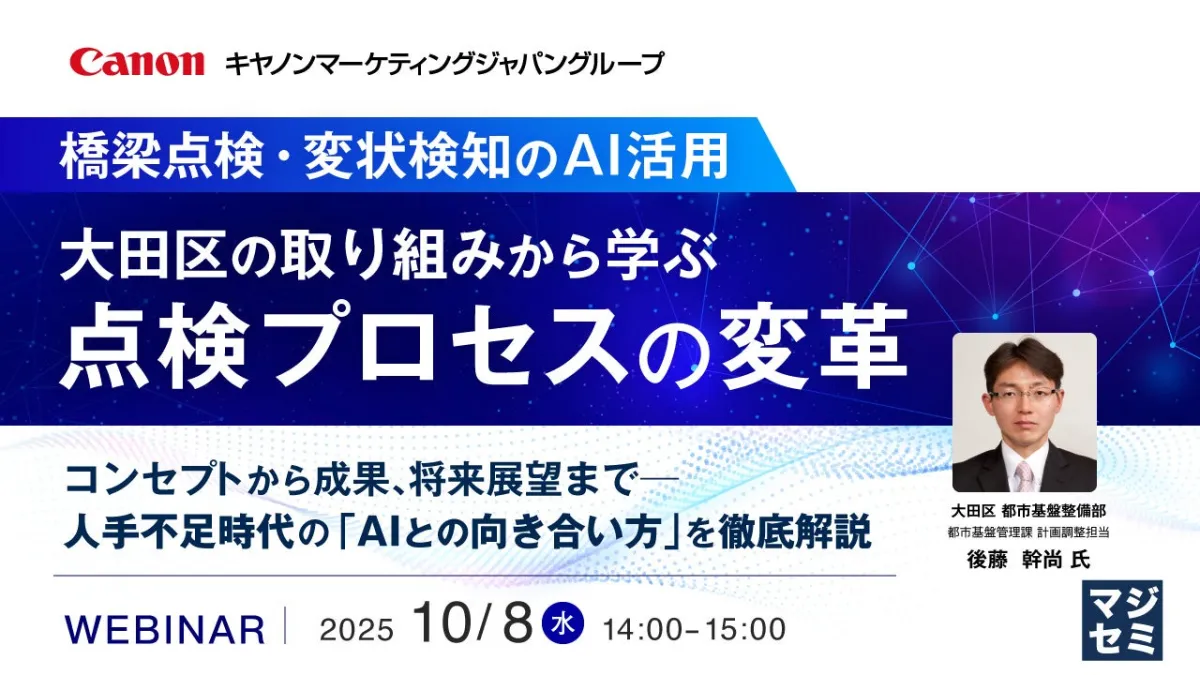 そこで注目されるのが、大田区における橋梁点検を含むスマートメンテナンスの取り組みです。このウェビナーでは、大田区で実施されたAIによる変状検知の具体的な内容やその成果、現在抱えている課題および今後の展望について詳しく探ります。また、公民連携を通じて自治体と民間企業がどのように協力し、最新の技術を実装しているのかという観点からも、実際の点検業務における「労力」「信頼性」「記録活用」等の課題整理が行われます。
