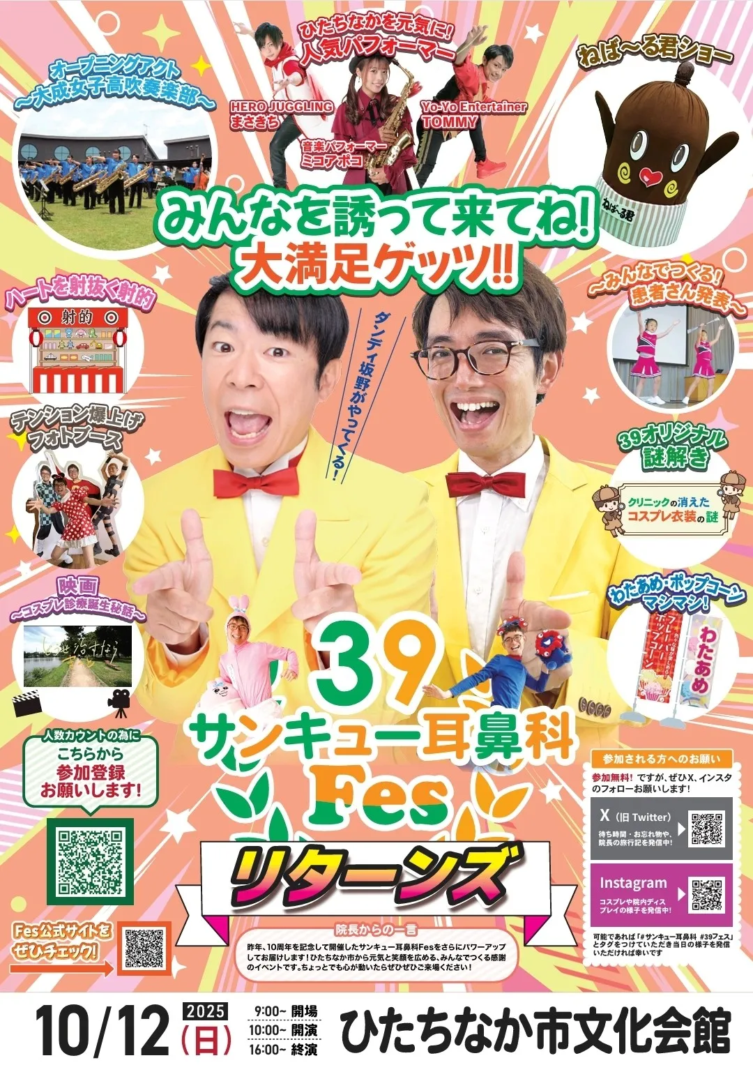 2025年10月12日、茨城県ひたちなか市文化会館で開催される「サンキュー耳鼻科Fes」では、地域への感謝と元気を届けることをテーマにしたイベントが執り行われます。このフェスには、豪華ゲストとしてお笑いタレントのダンディ坂野さんが登場し、盛り上げてくれることが決定しました。