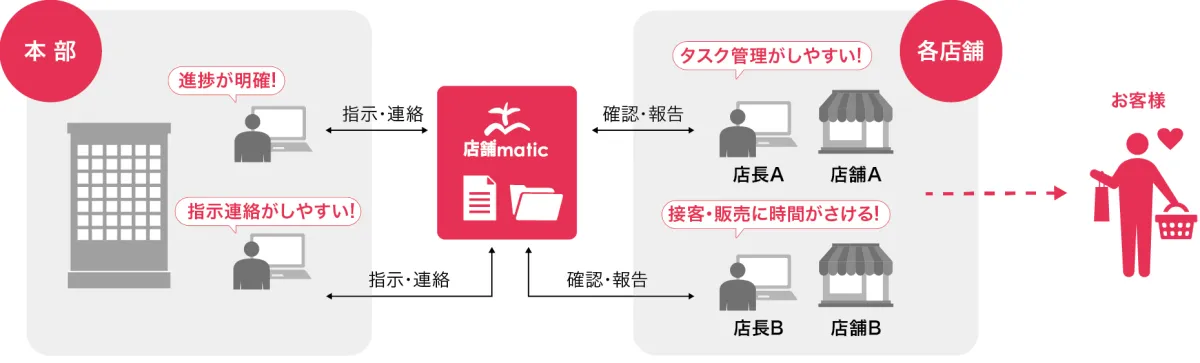 「店舗matic」は、本部から店舗間の指示伝達や情報共有を円滑にするためのクラウドサービスとして設計されています。本部が行うべき指示や報告事項が一元化され、各店舗のスタッフが必要な情報を迅速に取得できるようになります。このシステムを導入することで、今まで本部がメモやメールで行っていたコミュニケーションが一つのプラットフォームに集約され、業務の効率化が図れるのです。