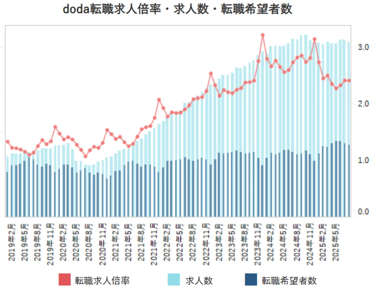 パーソルキャリア株式会社が運営する転職サービス「doda」が発表した2025年8月の転職求人倍率は2.42倍であり、前月と比べて変動はありませんでした。このデータは中途採用市場における需給バランスを示す指標で、dodaの会員登録者一人に対して提供される求人の件数を算出したものです。