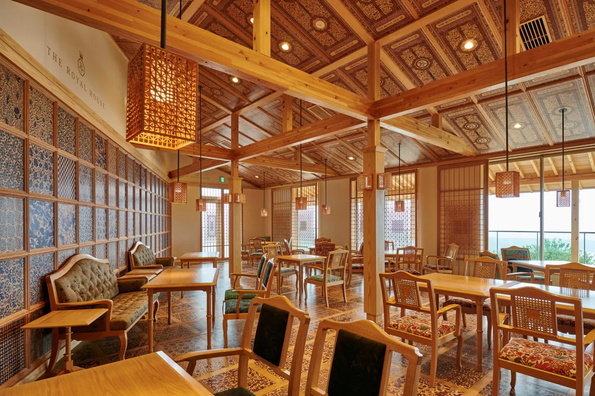 「THE ROYAL HOUSE」は、下田ロープウェイの寝姿山山頂に位置するレストランで、水戸岡鋭治氏のデザインによる施設です。天然木を用いた伝統的な工芸品や家具が散りばめられ、下田湾を見渡す絶景とともに、伊豆ならではの新鮮な海の幸や季節の野菜を活かした料理が楽しめます。
