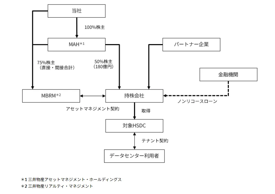 三井物産株式会社の100%子会社である三井物産アセットマネジメント・ホールディングス株式会社は、稼働型ハイパースケールデータセンター(HSDC)の取得を決定しました。この決定は、持株会社を設立することをも含み、関連契約が既に締結されています。三井物産アセットマネジメント・ホールディングスは180億円の出資を行い、持株会社の50%の株主となる見込みです。また、金融機関からノンリコースローンを調達する計画も進行中です。