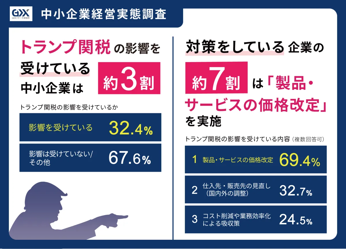 フォーバル GDXリサーチ研究所の所長、平良学氏は「トランプ関税の影響を受ける企業が全体の約3割で、現状では影響を受けていない企業が多いことが分かった。企業は今後の経営戦略を見直す必要がある」とコメントしています。外部の専門家の活用や、経営全般の見直しが必要です。