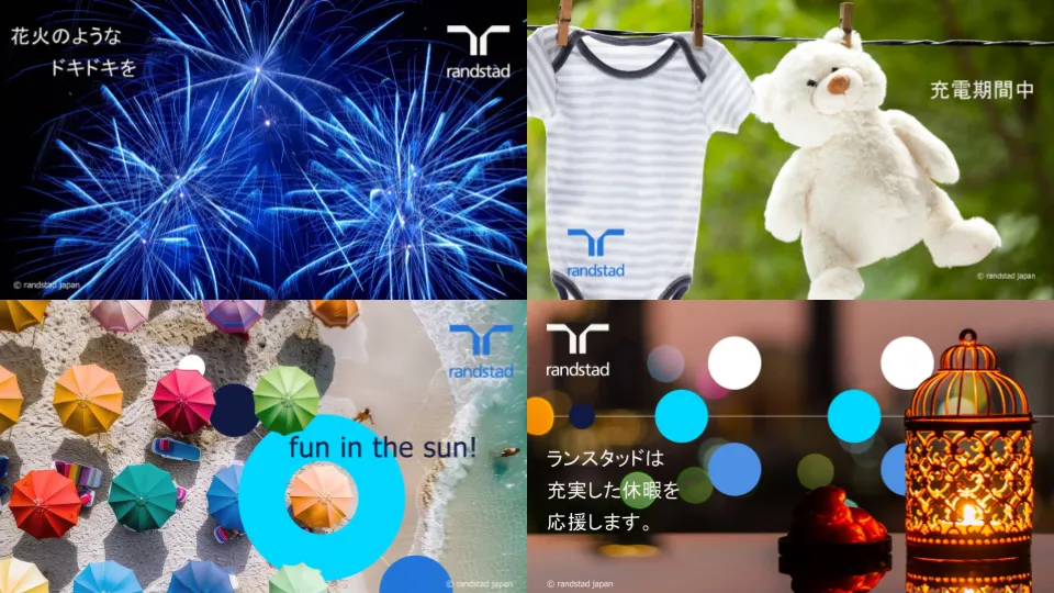 今年の不在通知デザインには、花火やキャンドルライト、ビーチ、ぬいぐるみといった夏をテーマにした印象的な画像が使われており、各デザインには楽しいメッセージが添えられています。「花火のようなドキドキを」、「ランスタッドは充実した休暇を応援します。」といった言葉が、受け取る側に夏の楽しい思い出を想起させることでしょう。