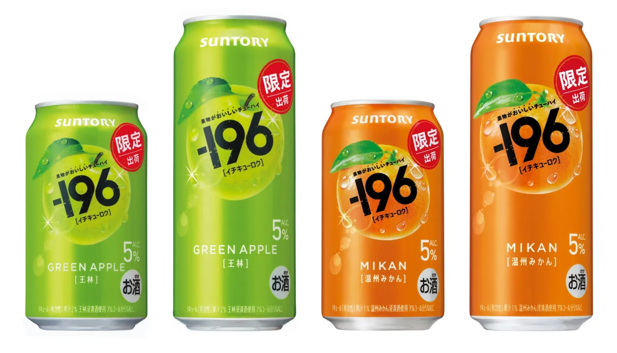 サントリー株式会社は、人気のチューハイシリーズ「-196(イチキューロク)」から新たに「-196〈王林〉」と「同〈温州みかん〉」を6月2日より全国で期間限定発売します。このシリーズは、2005年から続くロングセラーブランドで、特に旬の果物の風味を再現する「-196℃製法」にこだわった製品です。