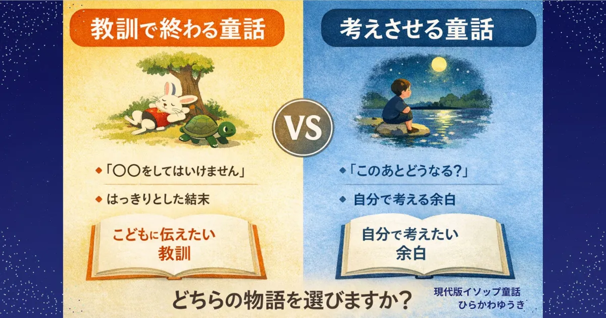 一方で、「考えさせる童話」は、あえて明確な答えを示さず、読者自身が物語をどう受け取るかに委ねます。この形式では、登場人物の行動や結末に対する解釈は年齢や人生経験に応じて変わり、子どもたちは自らの感性を頼りに、大人は人生経験を通じて新たな意味を見出すことができます。このように、考えさせる童話は、単に物語を読むだけでなく、読者の思考や感情を引き出して、深い読後体験を提供します。