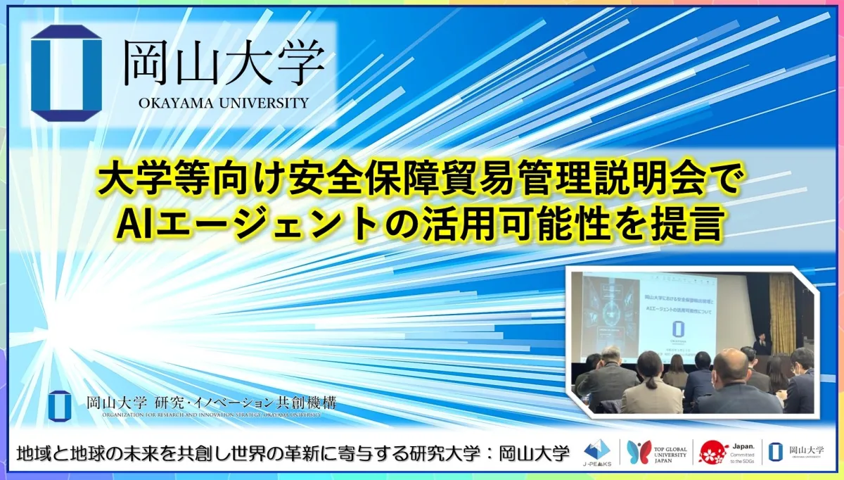 国立大学法人岡山大学は、2026年に向けた一連の取り組みの中で、特に安全保障貿易管理におけるAIエージェントの導入を進めています。2026年1月22日、大阪合同庁舎にて開催された「令和7年度大学等向け安全保障貿易管理説明会」では、研究・イノベーション共創機構の舩倉隆央副本部長が登壇し、具体的な取り組みとそれに伴う展望について紹介しました。