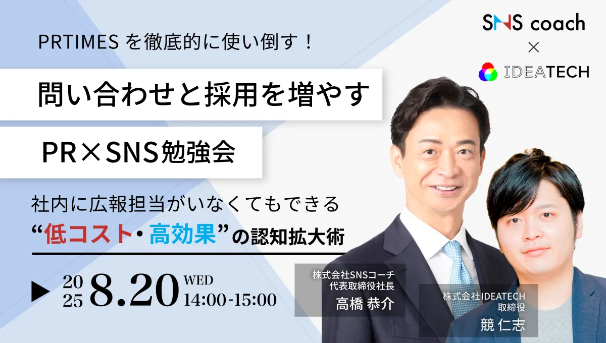 株式会社給与アップ研究所は、8月20日(水)に「PR TIMESを徹底的に使い倒す! 問い合わせと採用を増やす PR × SNS 勉強会」の無料オンラインセミナーを実施することを発表しました。このセミナーは、中小企業の広報や採用活動を支援するための内容が盛り込まれています。