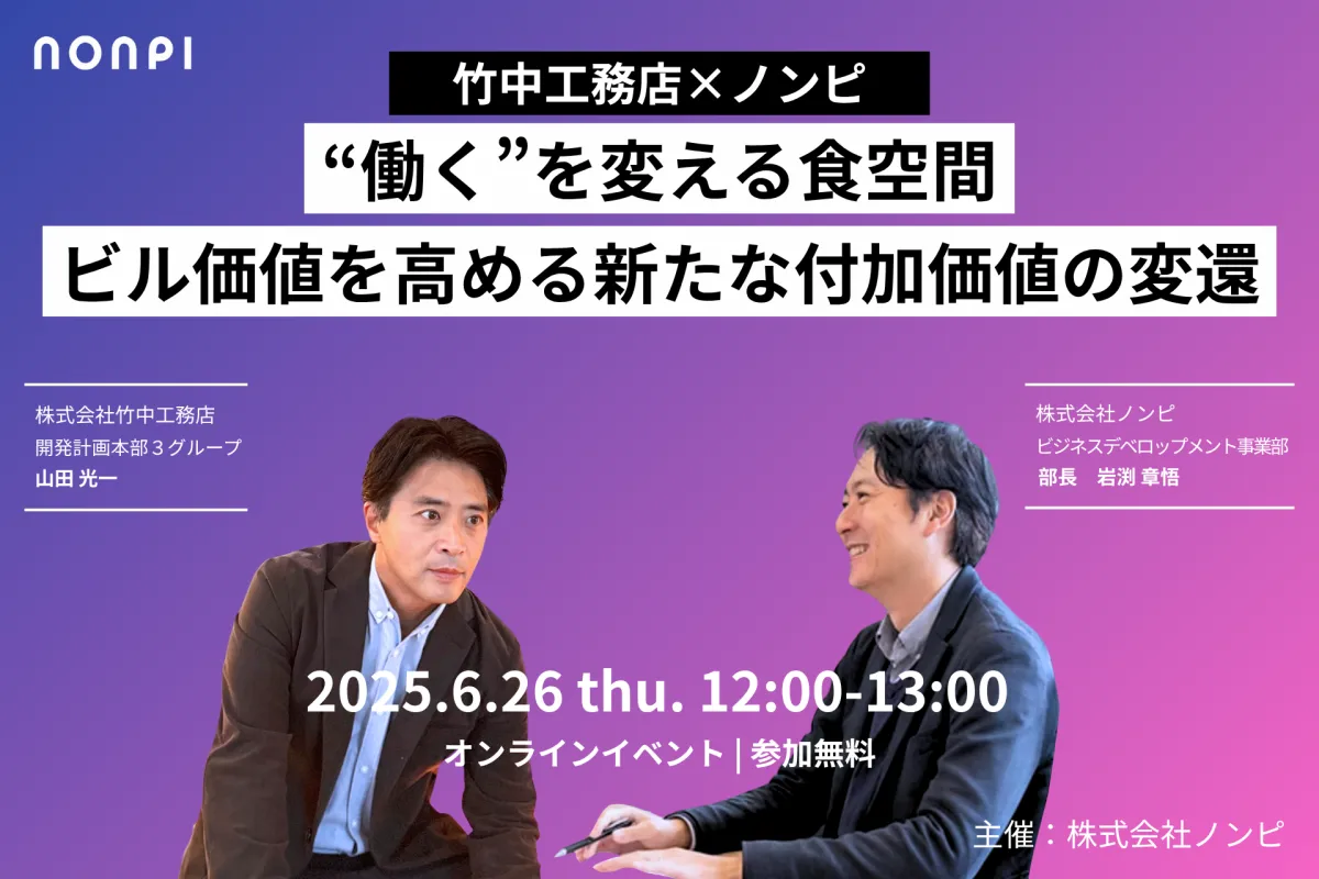 2025年6月26日、株式会社ノンピは竹中工務店の山田光一氏をゲストに迎え、“働く”という概念に迫るウェビナーを開催します。このイベントは、食を通して社内コミュニケーションを促進するノンピの取り組みの一環であり、特にオフィスビルにおける食空間の重要性に焦点を当てます。