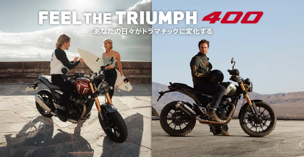 トライアンフモーターサイクルズジャパンが、待望の400ccモデルに特化した試乗キャンペーン「FEEL THE TRIUMPH 400」を2025年4月11日(金)から5月30日(金)まで開催することを発表しました。このキャンペーンは、トライアンフのアイコニックな400ccモデル「SPEED 400」と「SCRAMBLER 400 X」の魅力を、ライダーの皆さんに直接感じてもらうことを目的としています。