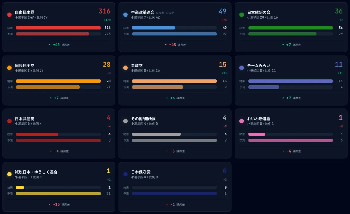 具体的には、中道勢力についての予想が76%の当選確率を示していたにも関わらず、実際の当選率はわずか6%に留まり、AIの予測を大きく裏切る形となりました。この結果から、AIによる選挙予測が必ずしも正確でないことが浮き彫りになり、逆に自民党の躍進がより明確になりました。