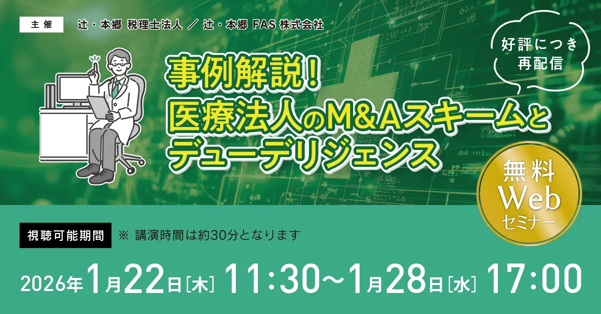 医療法人のM&A(合併と買収)は、特有の様相を呈しています。そのため、一般企業のM&Aとは異なる視点が求められます。特に、事前の調査であるデューデリジェンス(DD)は、十分に理解された上で進めることが必要です。そこで、医療法人のM&Aとデューデリジェンスについて詳しく学ぶことができる無料WEBセミナーが、2026年1月22日から再配信されます。このセミナーは、「辻・本郷 税理士法人」と「辻・本郷 FAS株式会社」が共催しており、実績のあるプロフェッショナルが講師を務めます。