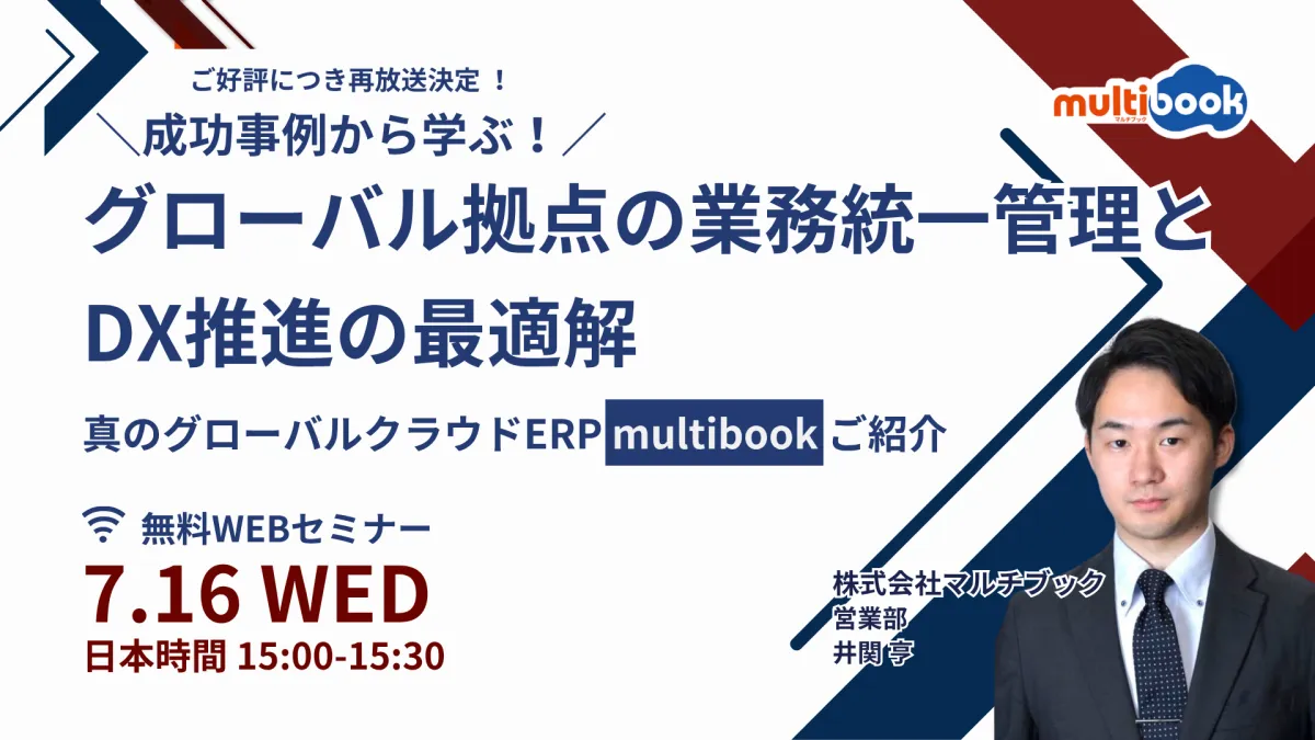 企業がグローバルに展開する中で、業務の統一管理はますます重要になっています。このたび、株式会社マルチブックは、全ての業界において役立つウェブセミナーを開催します。今回は、成功事例を基にしたグローバルクラウドERP「multibook」の効果的な活用法を紹介する機会です。