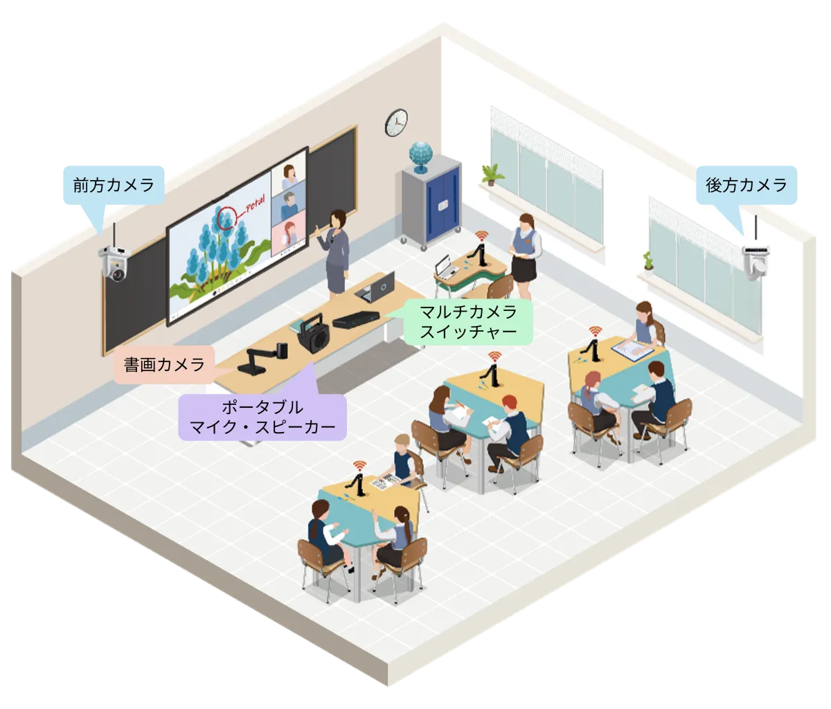 リモートカメラ:教室全体を撮影できるカメラを前方に配置し、後方には先生や板書を自動追尾して撮影するカメラを設置します。