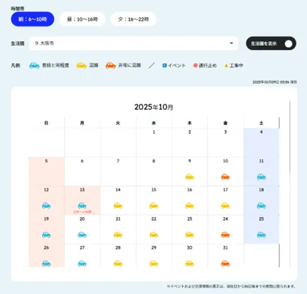 新たに加わった「渋滞予報カレンダー」は、阪神圏の渋滞状況を30日間先まで可視化し、外出予定を立てる際の格好の目安となります。この機能により、利用者は混雑を避けるための計画が立てやすくなります。