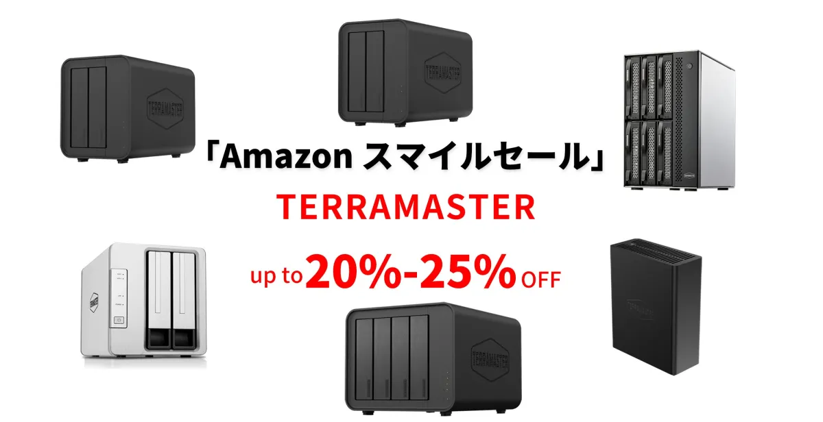 TERRAMASTER(テラマスター)は、Amazonの「スマイルセール」で特別価格のNAS(ネットワーク接続ストレージ)およびDAS(直接接続ストレージ)を提供します。このセールは、5月23日(金)から6月2日(月)23:59までの期間限定です。