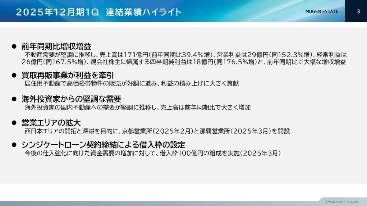 株式会社ムゲンエステート、2025年12月期第1四半期決算を発表