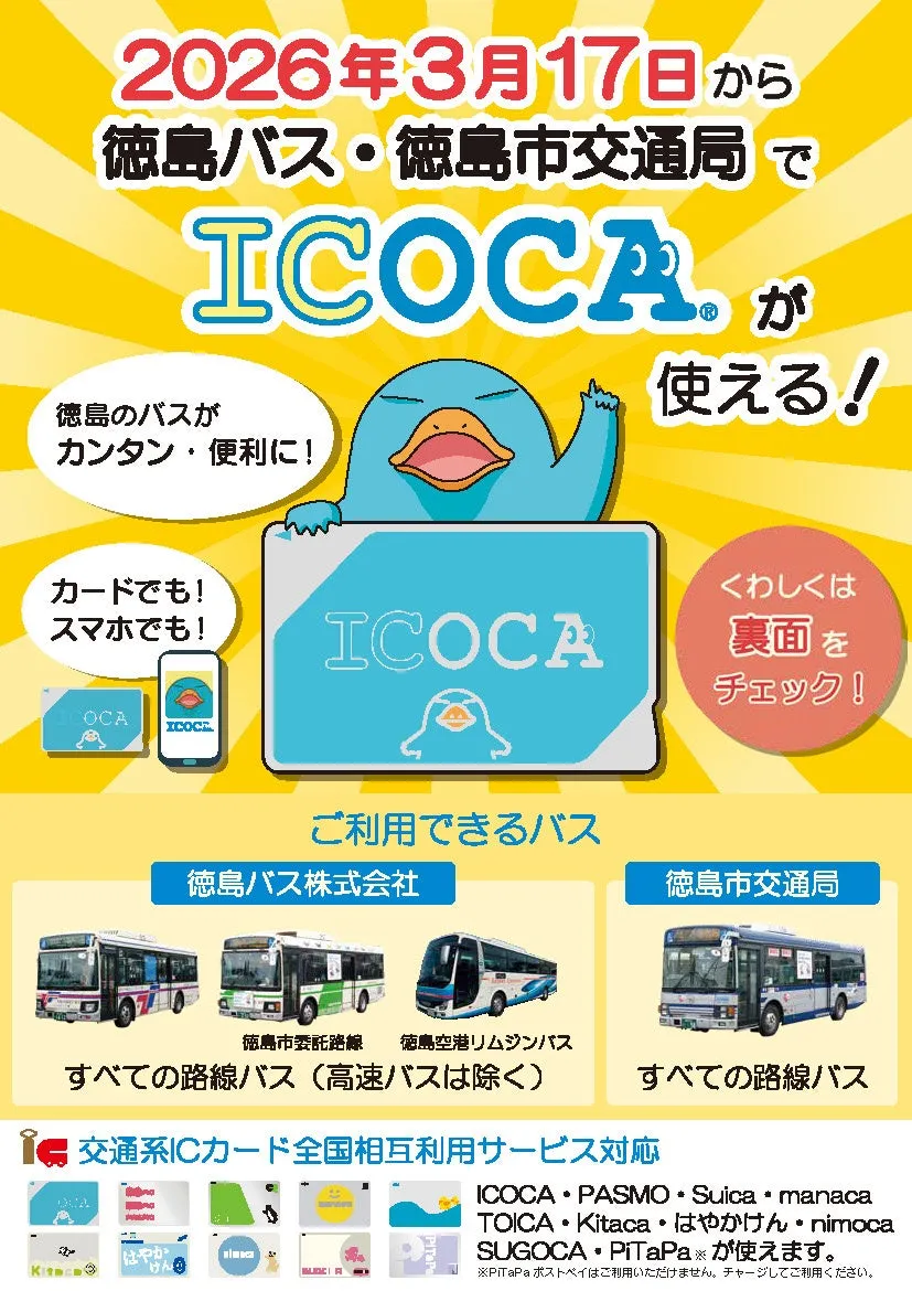 ICOCAは、交通系のICカードで、事前にチャージしておくことで乗車時にカードをかざすだけでスムーズに改札を通過できる便利なシステムです。徳島市では、市バスだけでなく、今後の導入を予定している他の交通機関でも利用予定です。日常の移動をより快適にするために、多くの市民に利用していただきたいと考えています。