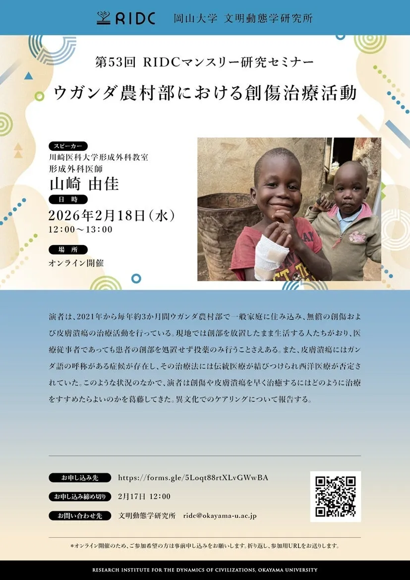 国立大学法人岡山大学が主催する本セミナーは、岡山大学文明動態学研究所(RIDC)によって開催される第53回RIDCマンスリー研究セミナーです。日程は2026年2月18日(水)の12:00〜13:00で、オンラインにて実施されます。