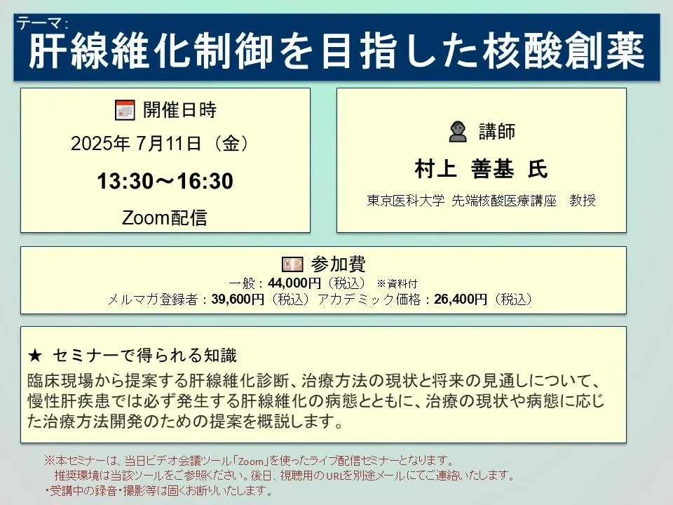 2025年7月11日(金)、肝線維化制御を目指す核酸創薬に焦点を当てたオンラインセミナーが開催されます。このセミナーは、先進的な医療技術や市場動向を提供する株式会社シーエムシー・リサーチによって主催され、講師には東京医科大学の村上善基教授が迎えられます。