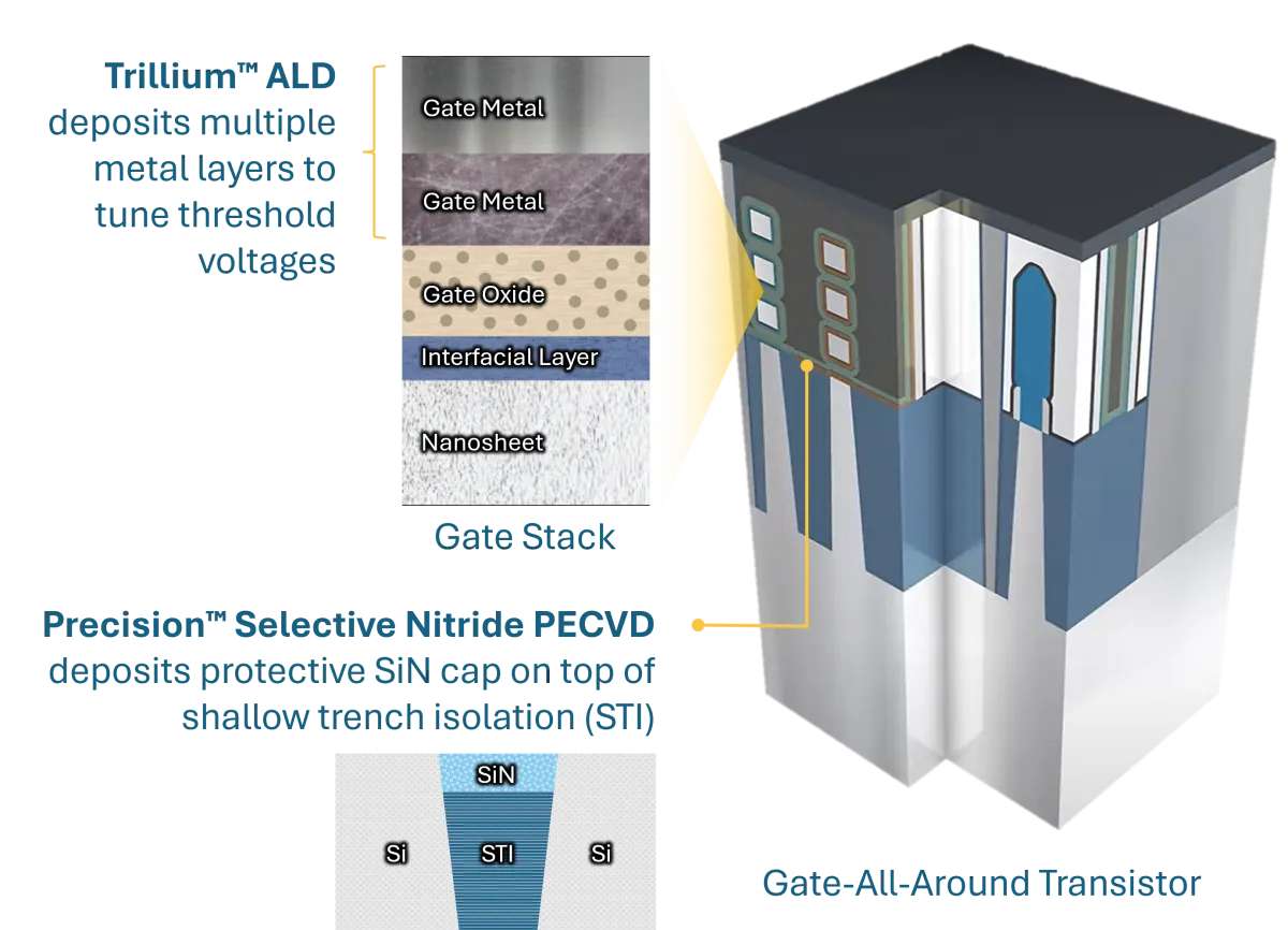 次に、Trillium™ ALDについても注目が集まります。これは、非常に複雑なGAAトランジスタのゲート構造を形成するために特化された装置です。メタル成膜は、高精度で行われ、トランジスタのスイッチング特性が一定に保たれます。成膜プロセスはオングストロームレベルで制御されるため、高い信頼性と性能向上が実現されます。屋内のクリーンルームでの作業によって、不純物からの保護も行われ、ナノシート間においても高品質な成膜が保証されます。