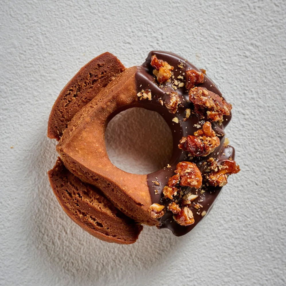 - くるみ、アーモンド、カシューナッツをキャラメリゼし、アクセントに塩を加えた一品。サクサクしたオールドファッション生地と、ビターなチョコレートの甘さが調和します。