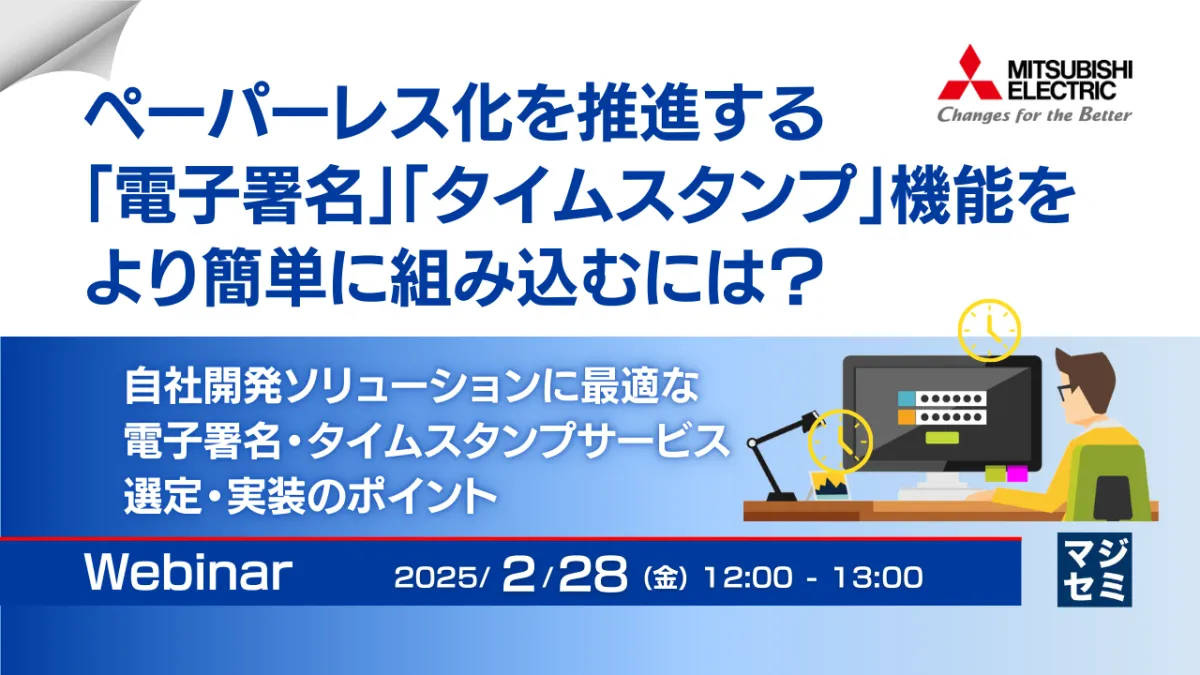 『ペーパーレス化を推進する「電子署名」「タイムスタンプ」機能をより簡単に組み込むには?』というテーマのウェビナーが開催されます。このセミナーは、IT事業者やシステム開発に携わる方々を対象としており、同業者以外は参加をお断りする場合がありますので、ご了承ください。