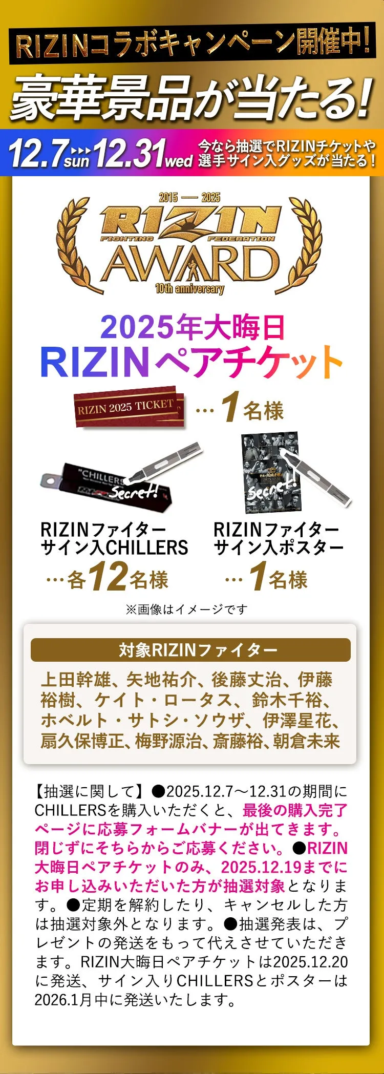 さらに、CHILLERSは「RIZIN 10th anniversary AWARD」の公式パートナーとしても参加。会場にはそのロゴが掲示され、RIZINの10周年を共に祝う姿勢がうかがえます。このパートナーシップは、互いのブランドイメージを強め、多くのファンに喜ばれる内容となっています。