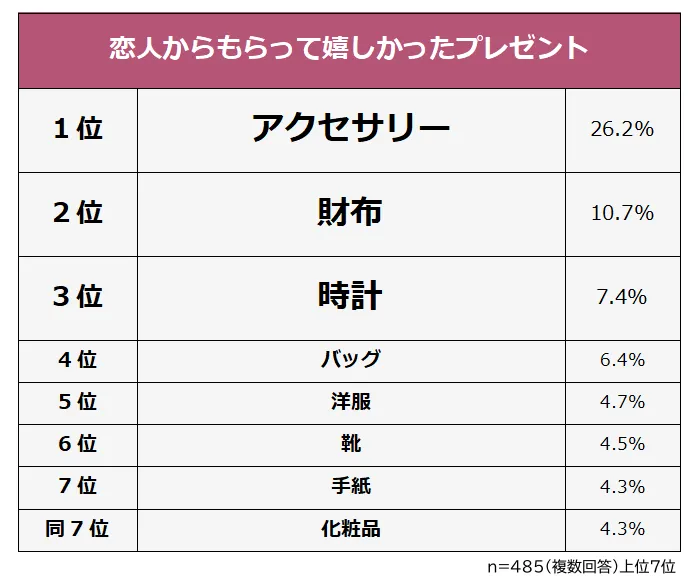 1位は「アクセサリー」で、これを挙げた理由として「欲しいと常に言っていたものだった」「初めてのブランド品だった」といった声が多く寄せられました。アクセサリーは、ただの装飾品以上の意味を持ちます。特に、カップルでお揃いのネックレスやリングをもらうと、より特別に感じるようです。