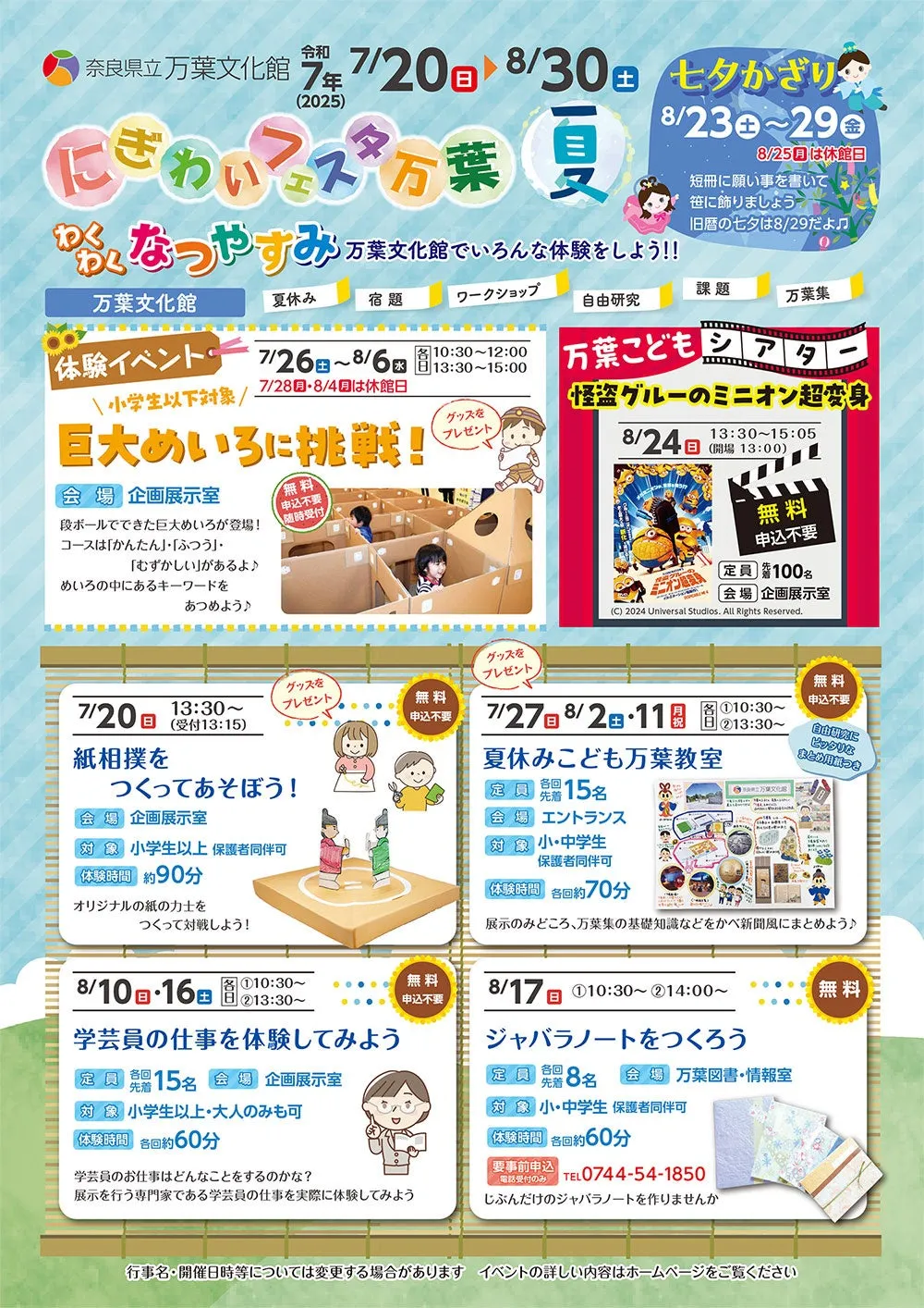 万葉文化館にて、7月20日(日)から8月30日(土)までの間、「にぎわいフェスタ万葉夏」が開催されます。このイベントは、夏休みを楽しむための多彩なプログラムが盛りだくさんで、特に土日祝日に多くの催しが用意されています。家族で訪れるのにぴったりの機会です。