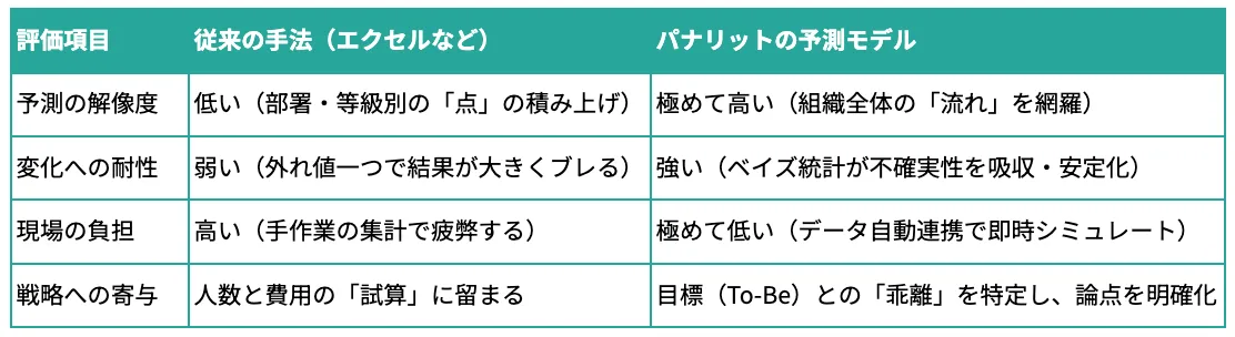 パナリットのシステムは、ベイズ推定を活用し、過去のデータと現在の動向を結びつけながら、リアルタイムで予測精度を向上させていく仕組みを採用しています。これは、環境が急変しても、今の組織状況に即した合理的な予測値を提供することが可能です。