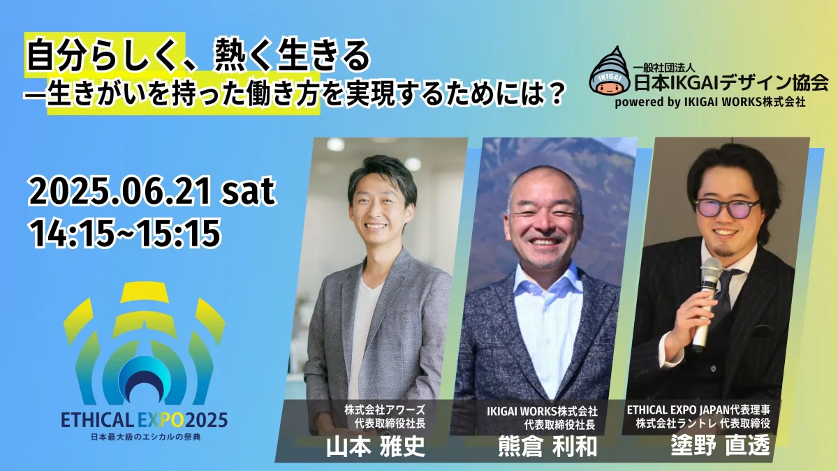 エシカルエキスポでは、「自分らしく、熱く生きる —生きがいを持った働き方を実現するためには?」というテーマのトークセッションが行われます。「働くとは何か?」という基本的な問いに対して、株式会社アワーズの山本氏をゲストに迎え、現役の経営者たちがそれぞれの視点からお話しします。