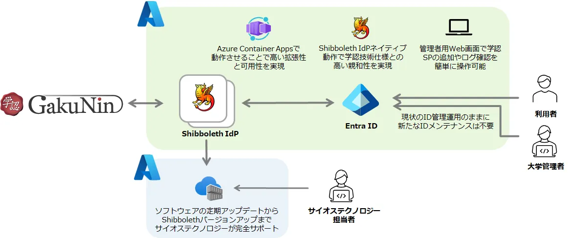 ただし、これらのサービスを利用するためには、専門的な技術知識が必要となり、知識を持つ教職員の確保や、運用にかかる費用が大きな課題でした。サイオステクノロジーはこの課題を解消するため、Shibboleth IdPをコンテナ化し、Azure基盤への導入を支援します。