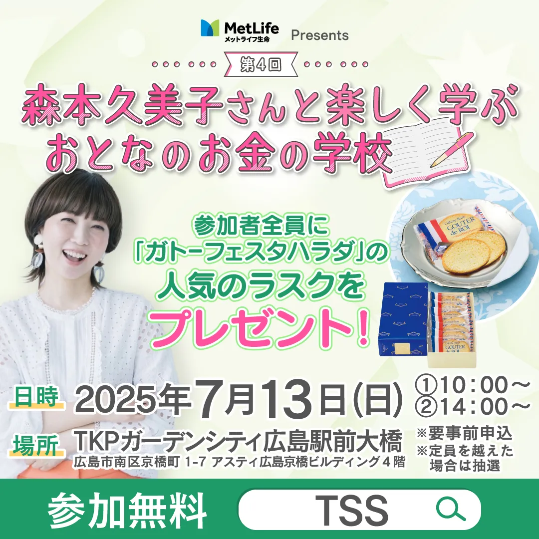 2025年7月13日(日)、広島で「第4回森本久美子さんと楽しく学ぶおとなのお金の学校」が開催されます。このセミナーは、家計を見直したい方や資産づくりに興味がある方、子どもの教育資金を考える方々に向けた内容です。お金に関する知識を楽しく学べる絶好のチャンスです!