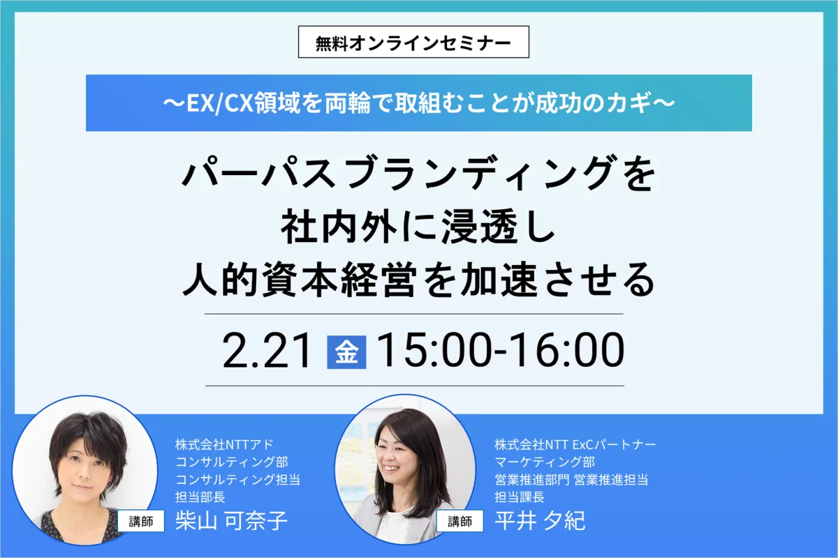 2025年2月21日、株式会社NTTアドと株式会社NTT ExCパートナーの共催による無料ウェビナーが開催されます。このセミナーは、企業が抱える組織文化の課題を解決するために、パーパスブランディングを通じて人的資本経営を加速させる方法に焦点を当てています。