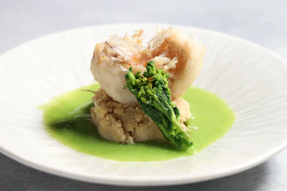 この御膳では、甘鯛のうろこ揚げがメインディッシュとして登場します。唐蒸し風のあんかけとともに提供されるこの一品は、油で揚げることでサクサクとした食感を楽しめるだけでなく、その見た目はまるで開花した桜のような美しさを誇ります。さらに、石川県産のきくらげや筍を取り入れたおからにのせて、深みある餡で仕上げられる一体感ある味わいに仕上げられています。