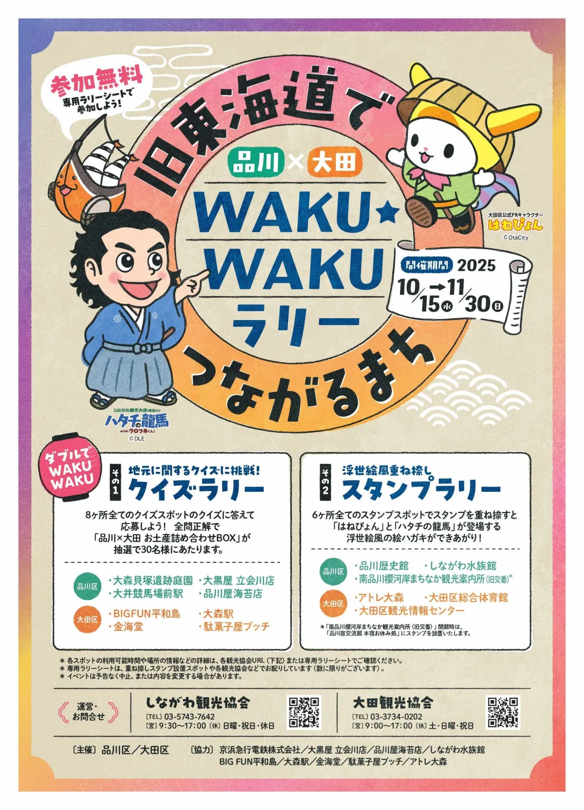 品川区と大田区が手を組み、特別なイベント「品川×大田 旧東海道でつながるまち WAKU☆WAKUラリー」を10月15日から11月30日まで開催します。旧東海道と大森エリアの魅力を発見しながら、楽しむことができるこのイベントは、参加無料です!