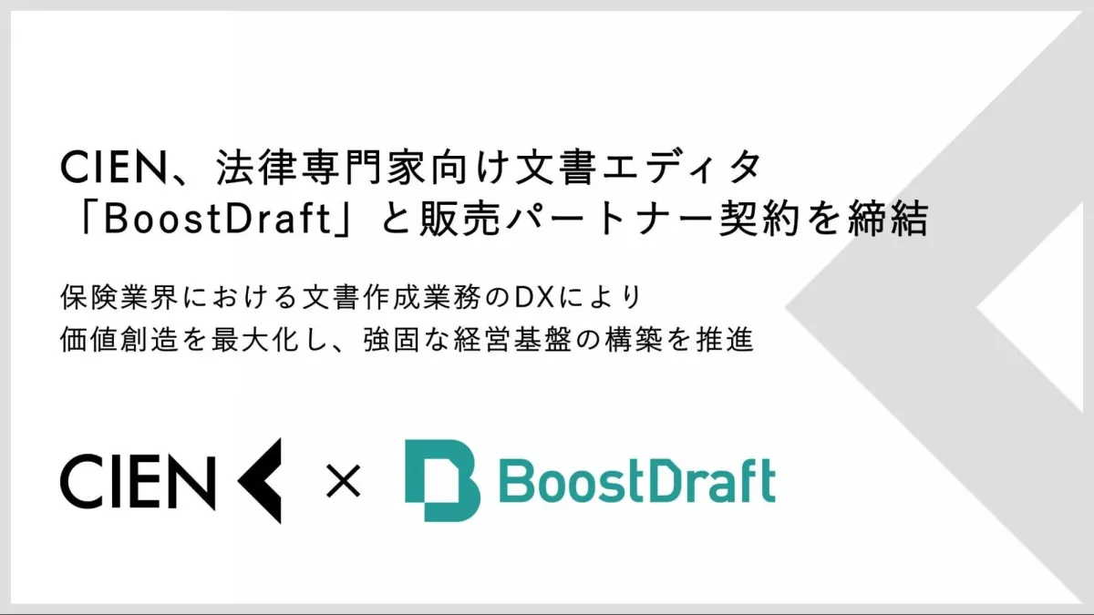 株式会社CIENは、保険業界に特化したコンサルティングサービスを提供するプロフェッショナルファームであり、長年の経験と専門的知識を背景に事業を展開しています。一方、株式会社BoostDraftは法律専門家専用の文書エディタを開発しており、特に法的文書の効率的な作成を可能にする技術を有しています。