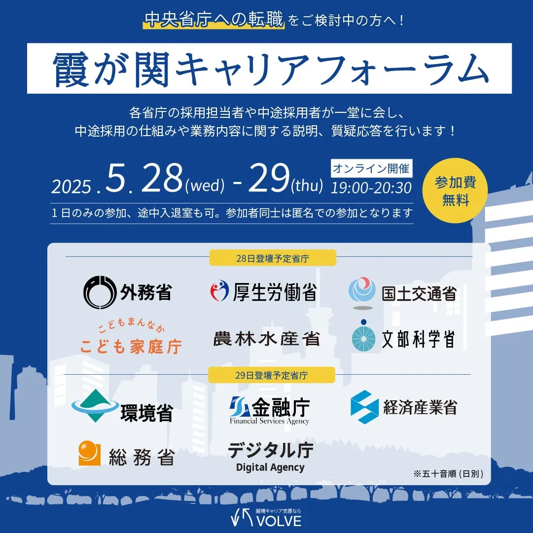 VOLVE株式会社が主催する「第4回霞が関キャリアフォーラム」が、2025年の5月28日と29日にオンラインで実施されます。このイベントは中央省庁への転職を希望する方や、まずは情報を収集したい方に最適な機会です。過去に行われたフォーラムは好評を博しており、参加者の皆さまからの評価を受けて、さらに充実した内容で開催されます。