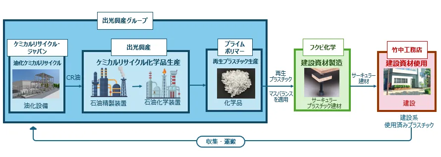 出光興産株式会社、株式会社竹中工務店、ケミカルリサイクル・ジャパン株式会社、フクビ化学工業株式会社、株式会社プライムポリマーの5社は、使用済みプラスチックを資源として取り入れた再生プラスチックの製造とその建設資材への応用に成功しました。この取り組みは、持続可能な未来に向けた大きな第一歩といえるでしょう。
