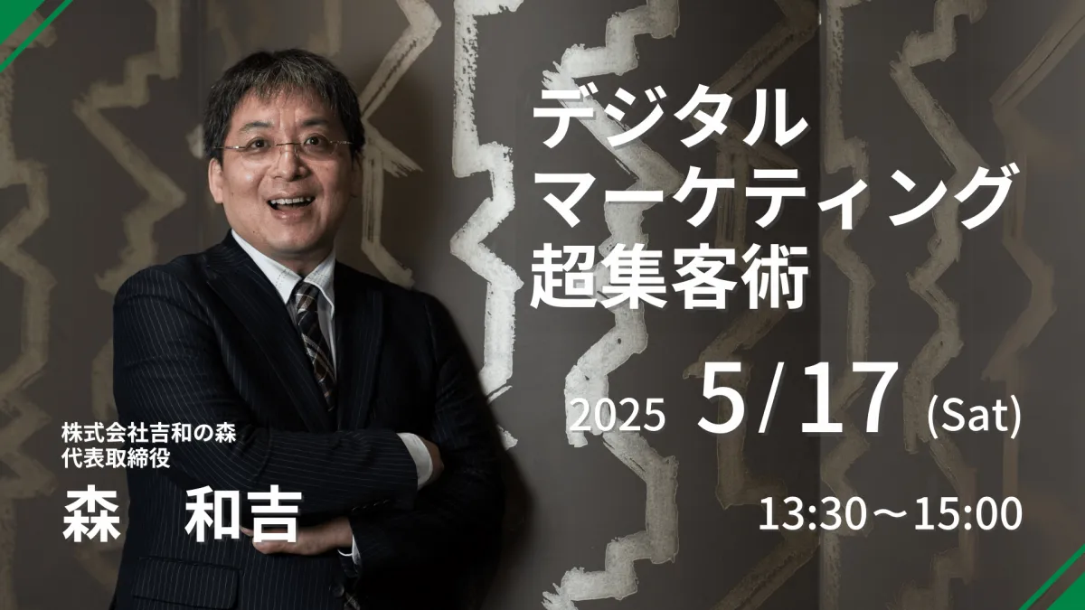 デジタルマーケティングのコンサルティング・運用サービスを提供する株式会社吉和の森の代表取締役である森和吉氏が講師として登壇。新しいビジネスの視点を学べるチャンスです。